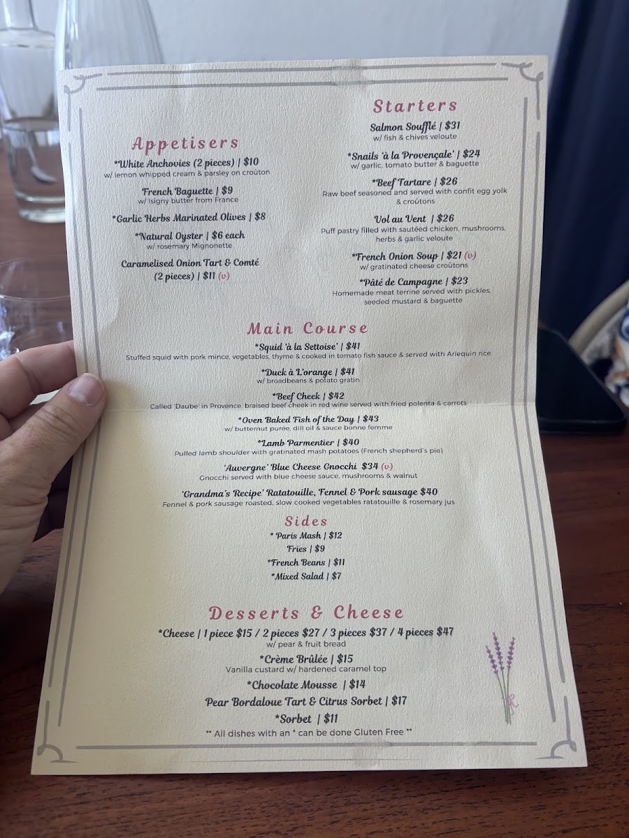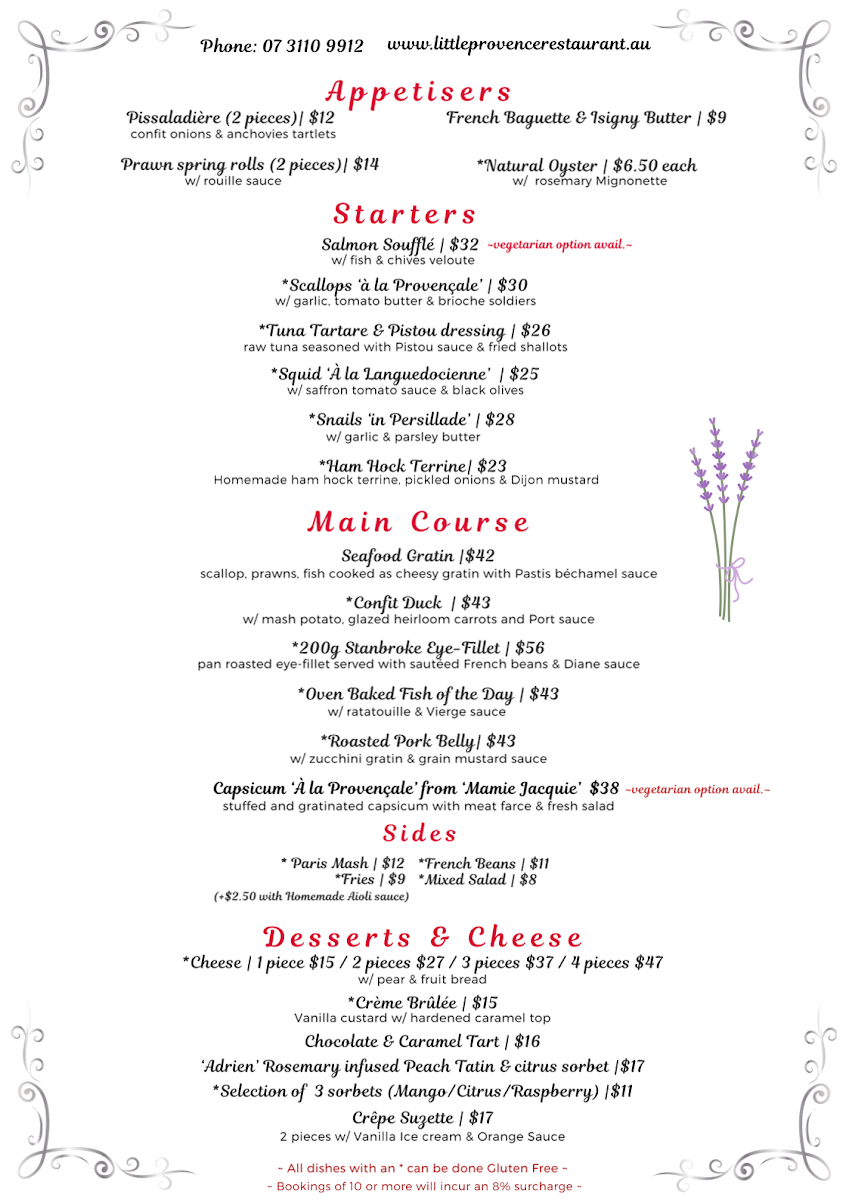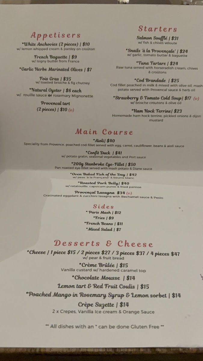 The menu at Little Provence Restaurant offers a delightful range of French-inspired dishes, each carefully crafted with rich, vibrant flavors. For appetizers, try the Pissaladière (2 pieces) or enjoy the simplicity of French Baguette & Isigny Butter. The Prawn Spring Rolls (2 pieces) and Natural Oysters are also perfect starters for those seeking a lighter bite. When it comes to the starters, the Salmon Soufflé stands out, along with the flavorful Scallops 'à la Provençale and the refreshing Tuna Tartare with Pistou Dressing. For something a bit more indulgent, the Squid 'A la Languedocienne and Snails 'in Persillade offer a truly authentic taste of Provence.